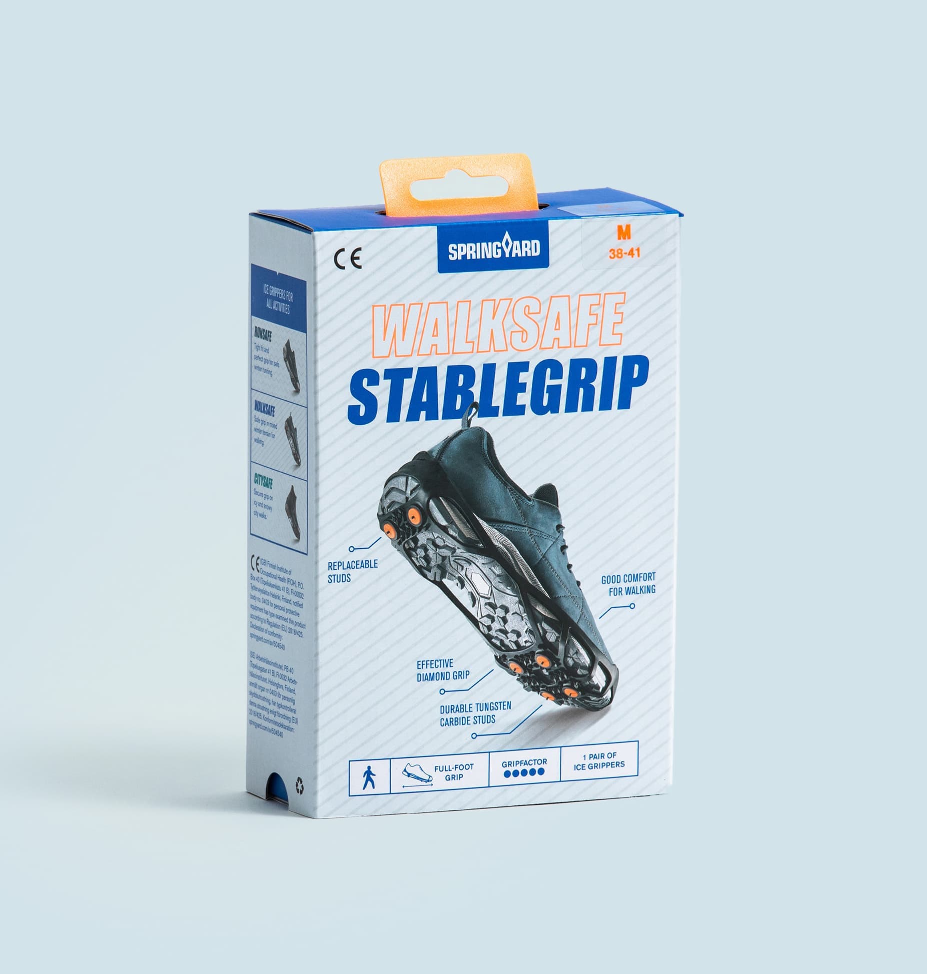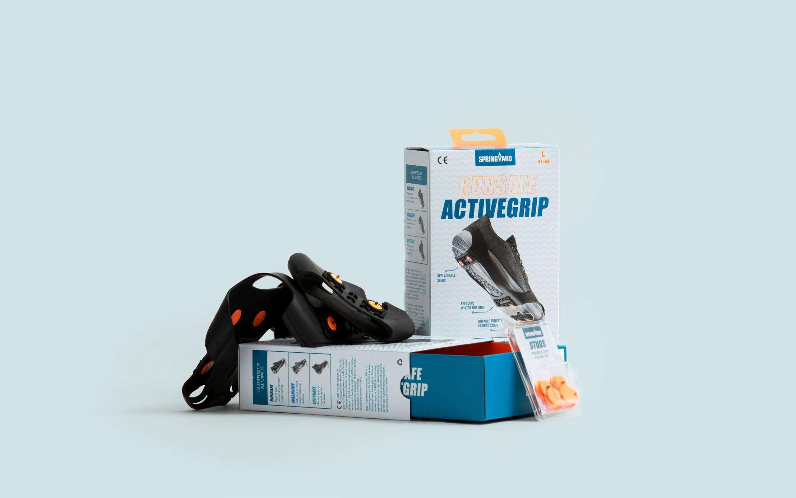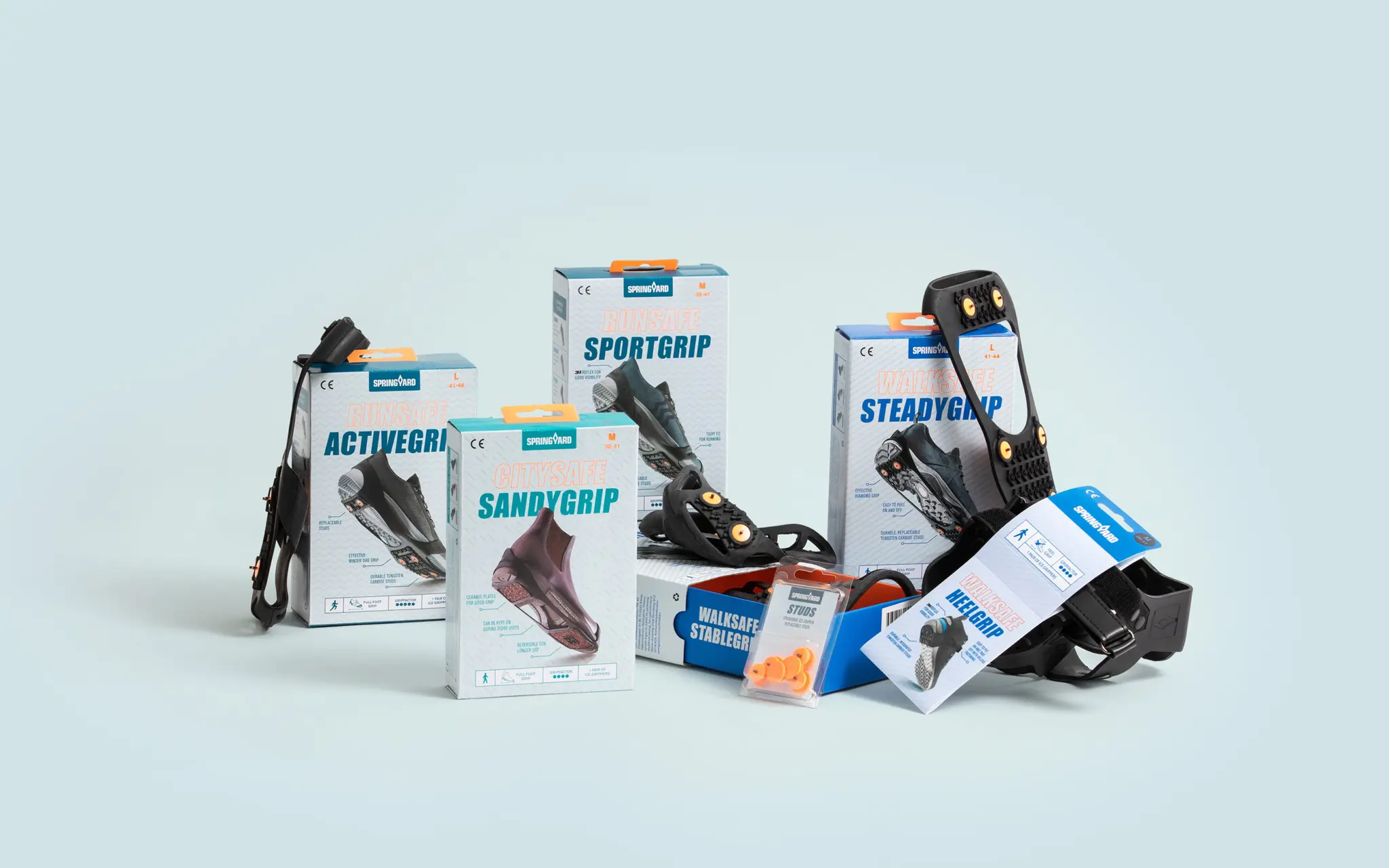 Halkskydd och broddar har en mängd olika features, användningsområden och målgrupper. Ung eller gammal, storstad, löpning eller skogspromenad, utbytbara dubb eller fasta, var bara något av det vi hade att ta hänsyn när vi utvecklade ett helt nytt förpackningskoncept för Springyard.
